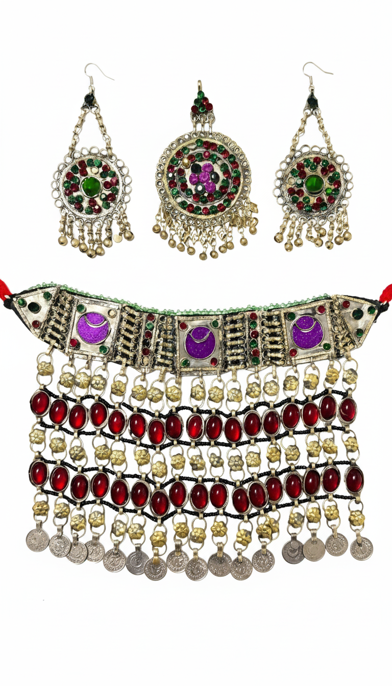 Royal Afghan Ethnic Jewelry – Necklace, Mantika & Earrings, Handmade
